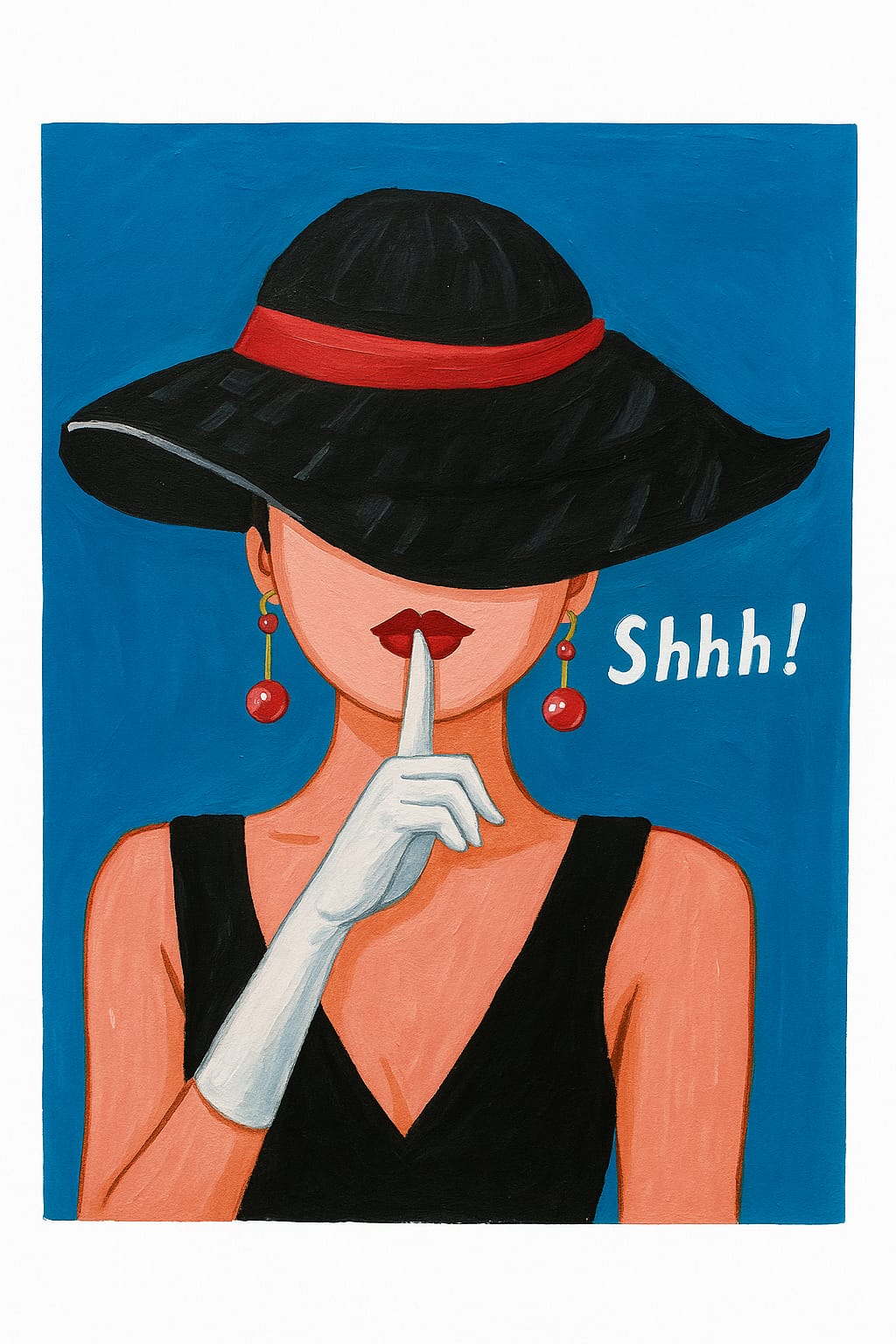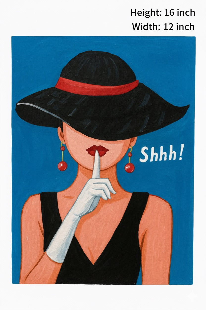 This captivating handmade painting portrays an elegant woman in a black hat with a red band, stylish earrings, and a classic black dress, holding a finger to her lips with the word “Shhh!” beside her. The artwork beautifully captures mystery, sophistication, and poise, making it a perfect choice for modern home décor or art enthusiasts who appreciate minimalist elegance. Ideal for living rooms, bedrooms, or art galleries, this painting adds a touch of charm and intrigue to any space.